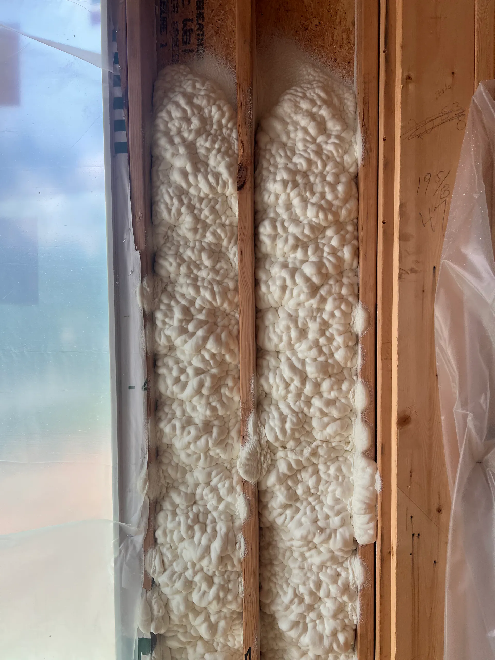 Close-up view of closed-cell spray foam insulation applied between wall studs by Michigan Insulation Pros.
