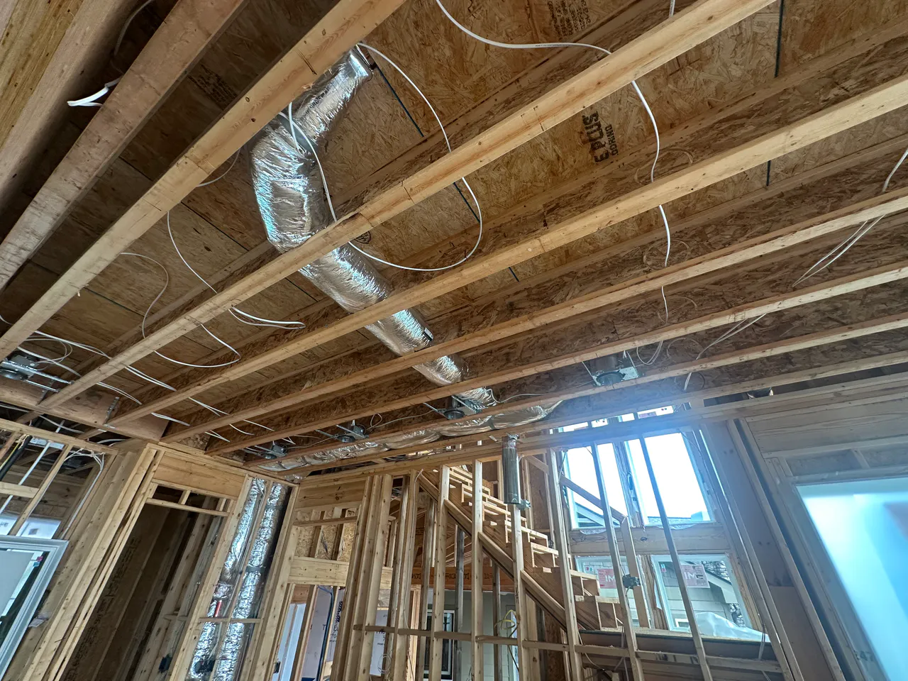 Michigan Insulation Pros preparing exposed ceiling framing and duct systems in a Michigan home for professional spray foam insulation to improve energy efficiency and indoor air quality.