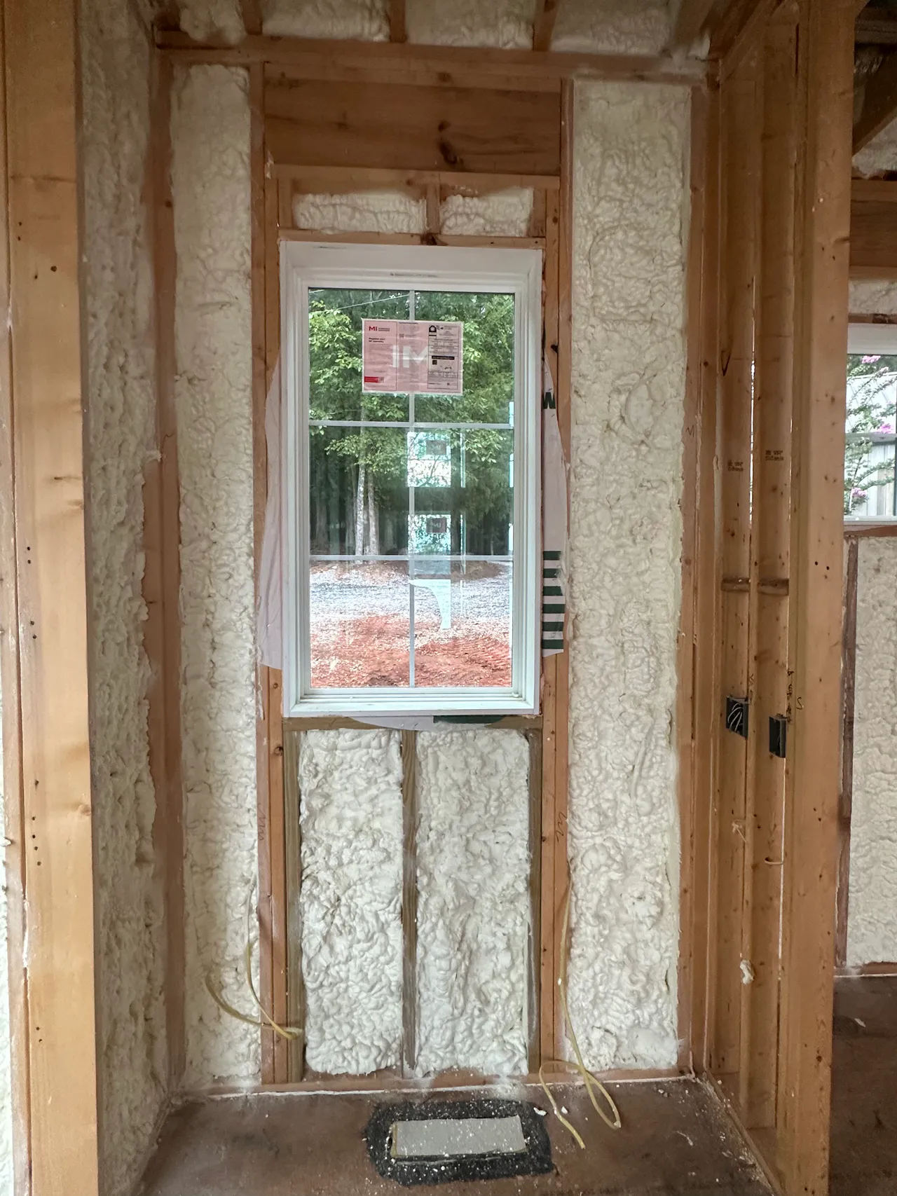 Close-up of spray foam wall insulation installed by Michigan Insulation Pros in a Kalamazoo, Michigan home—sealing gaps around a window to improve energy efficiency and comfort.