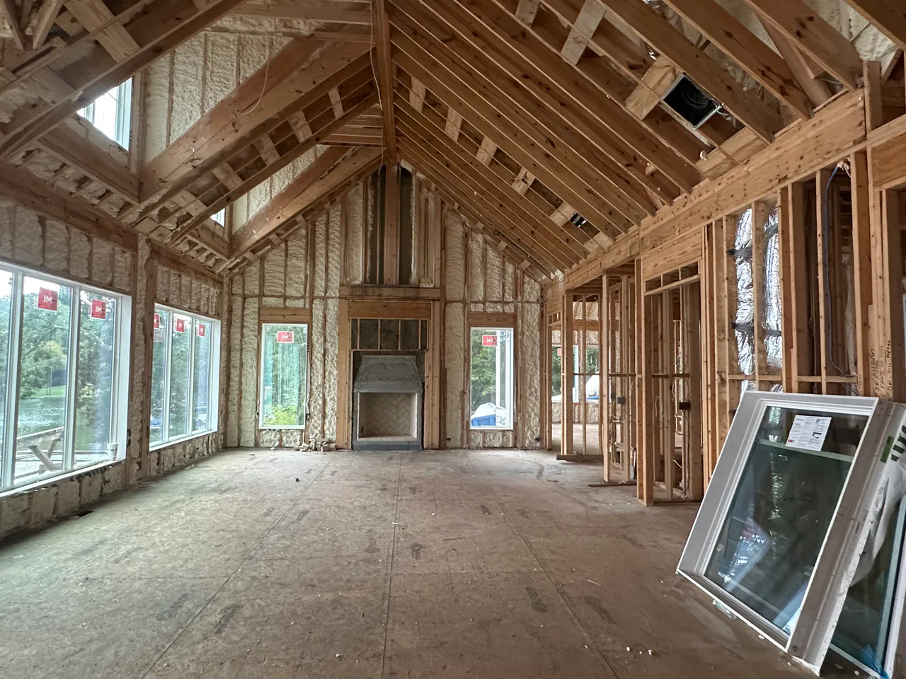 Michigan Insulation Pros completing spray foam insulation on cathedral ceilings and walls inside a new Ann Arbor home.