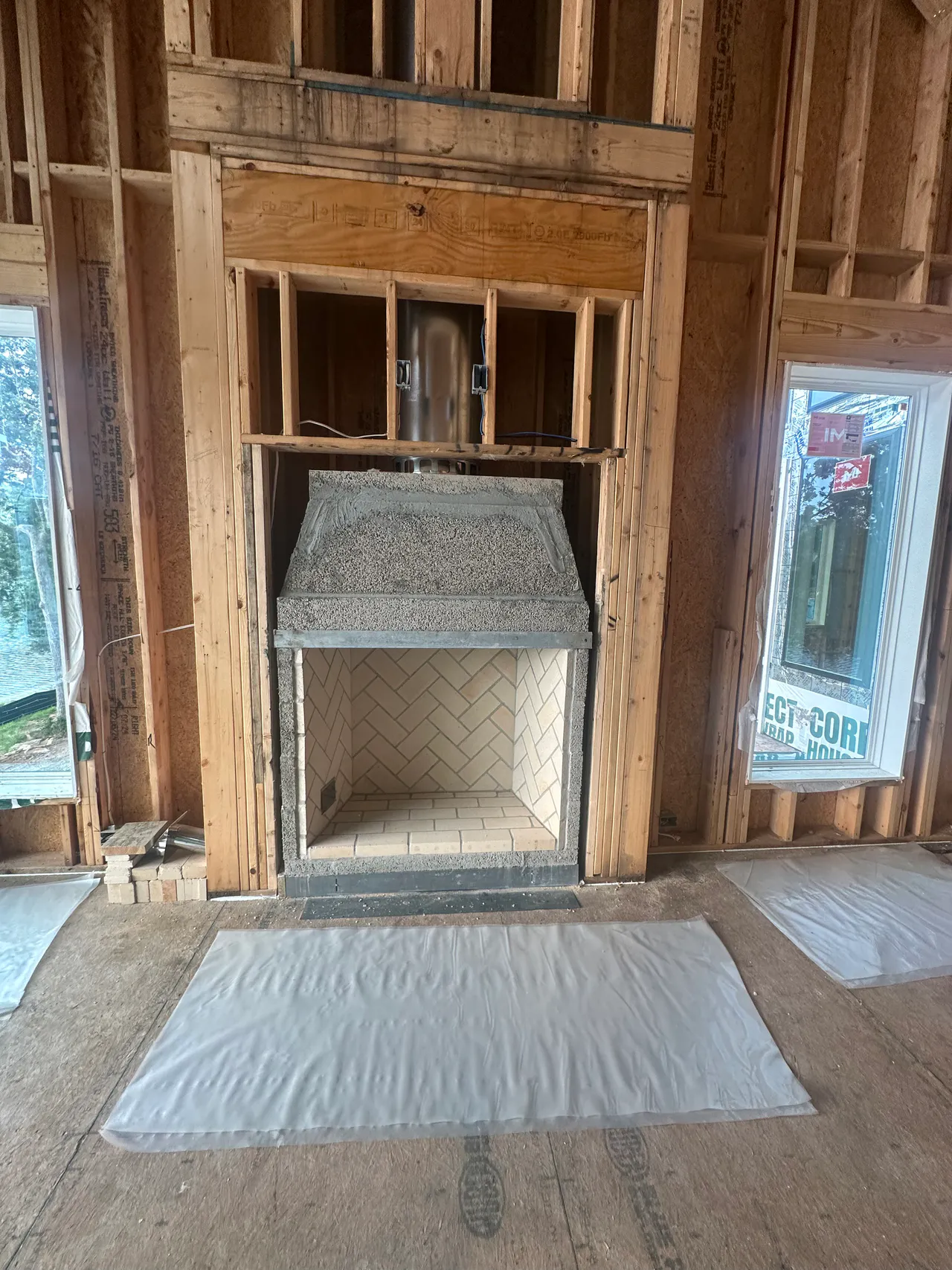 Framed upper wall and chimney structure of a Traverse City, Michigan home, prepared by Michigan Insulation Pros for attic and fireplace insulation to improve energy efficiency and airflow control.
