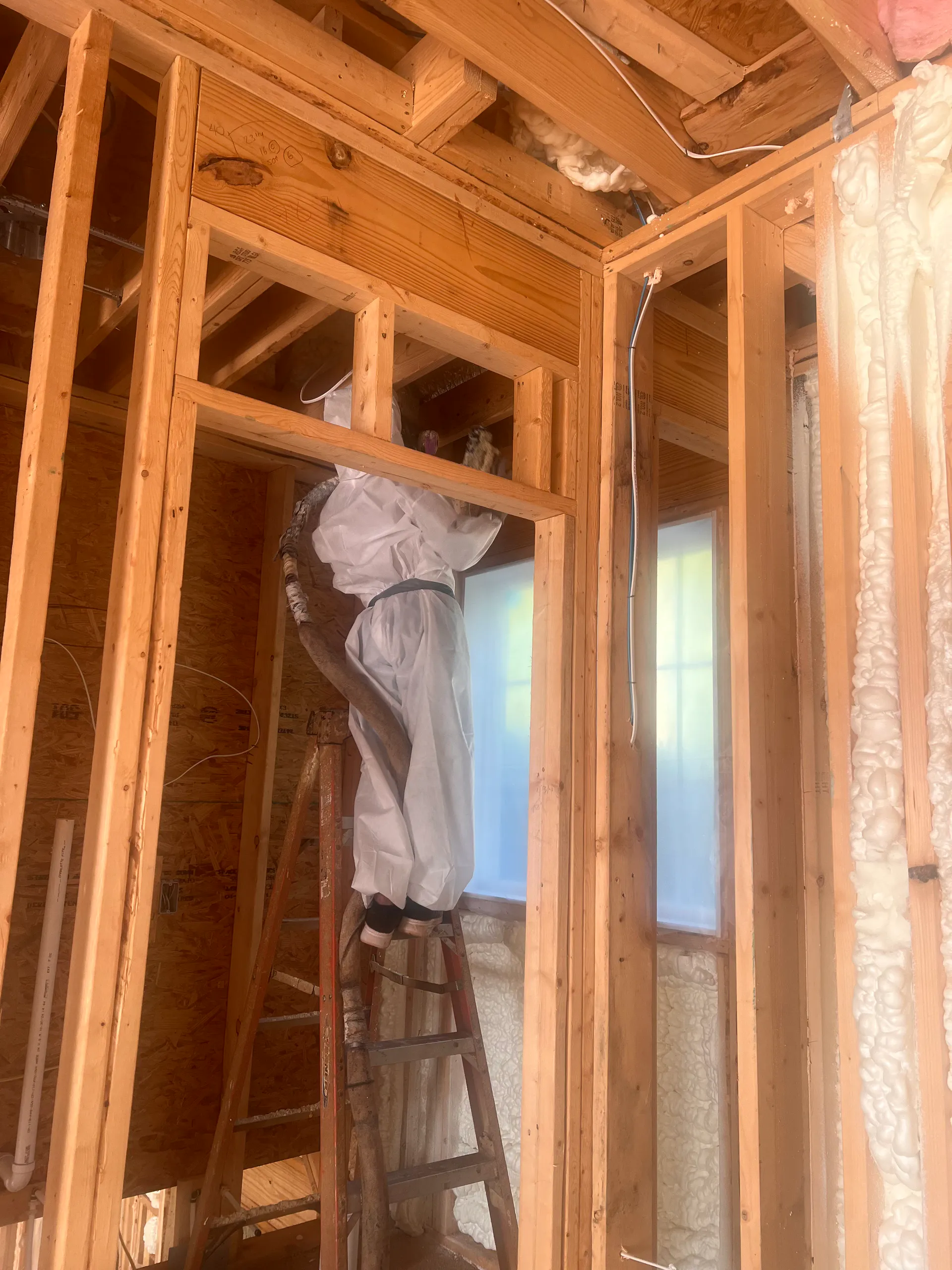 Michigan Insulation Pros technician applying spray foam insulation inside wall framing of a Michigan home.