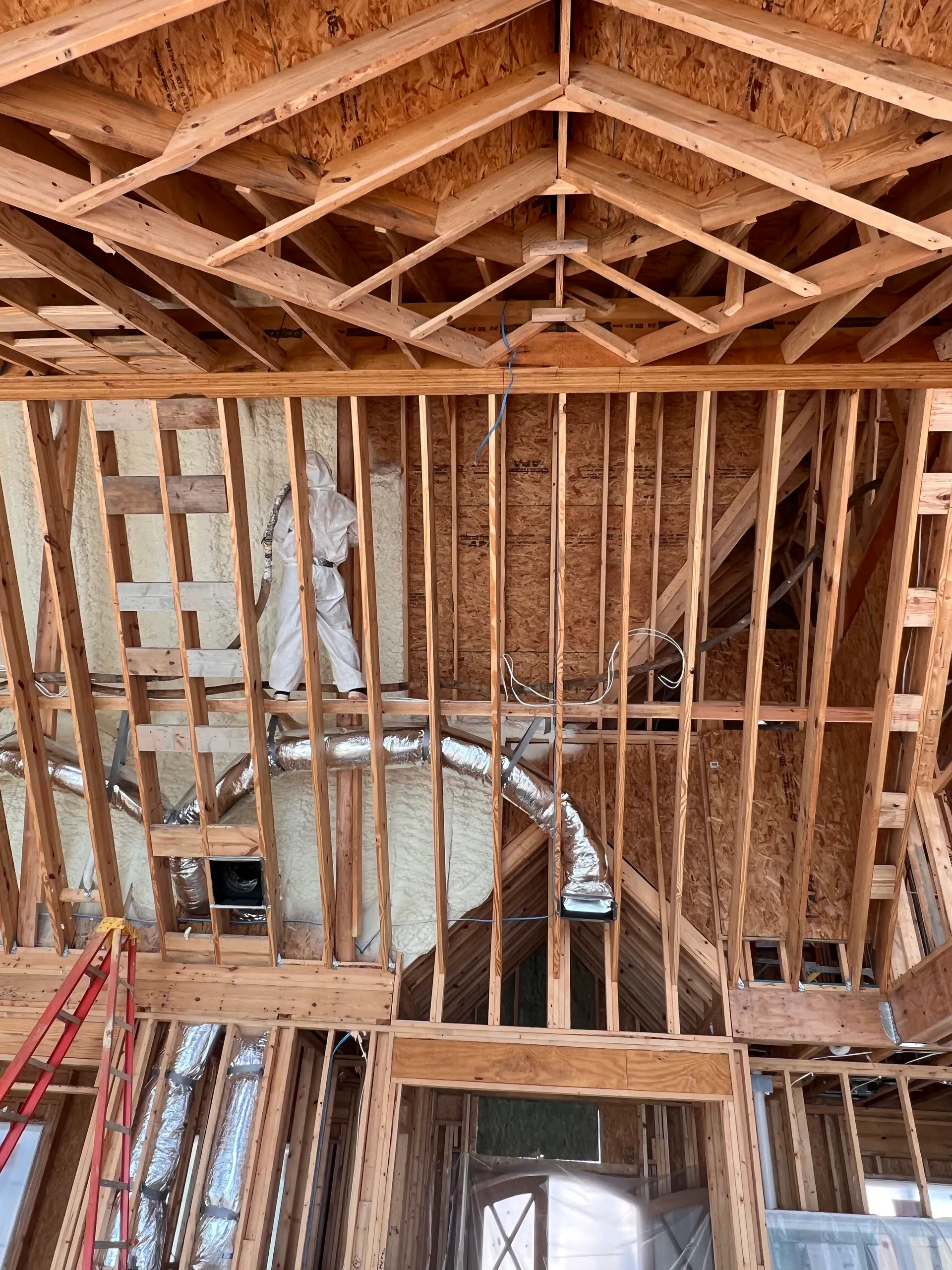 Michigan Insulation Pros technician applying spray foam insulation in a home attic, sealing every corner for improved energy efficiency and reduced heat loss across Michigan homes.